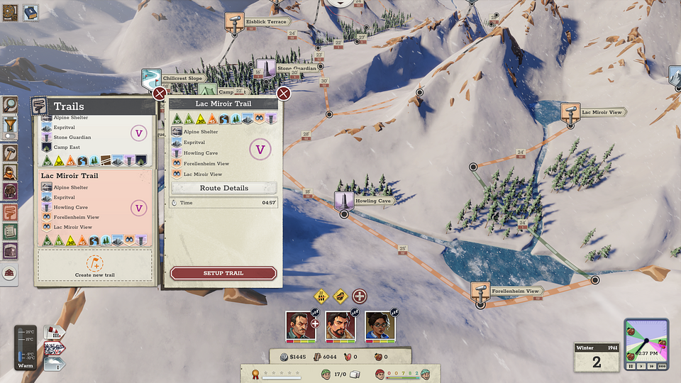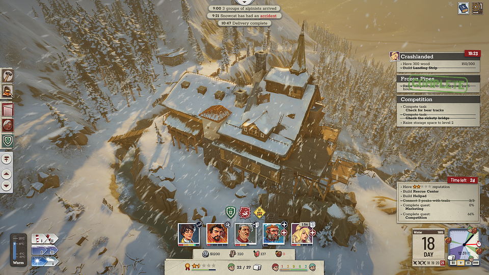 Rozgrywka wykracza poza ściany schroniska. Gracze mogą wytyczać szlaki, planować punkty widokowe i omijać niebezpieczne przełęcze. System zadań pozwala również organizować akcje ratunkowe, transportować zapasy i odkrywać kolejne rejony alpejskich krajobrazów.