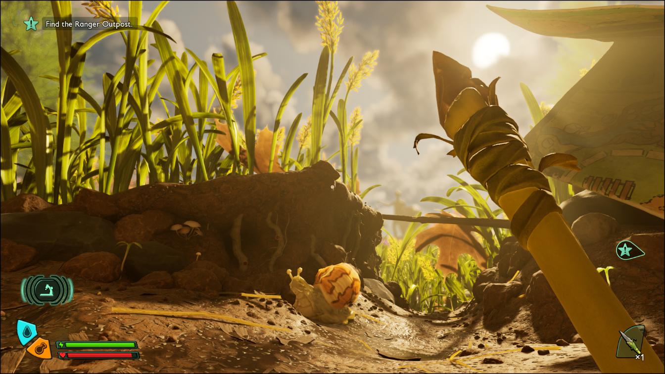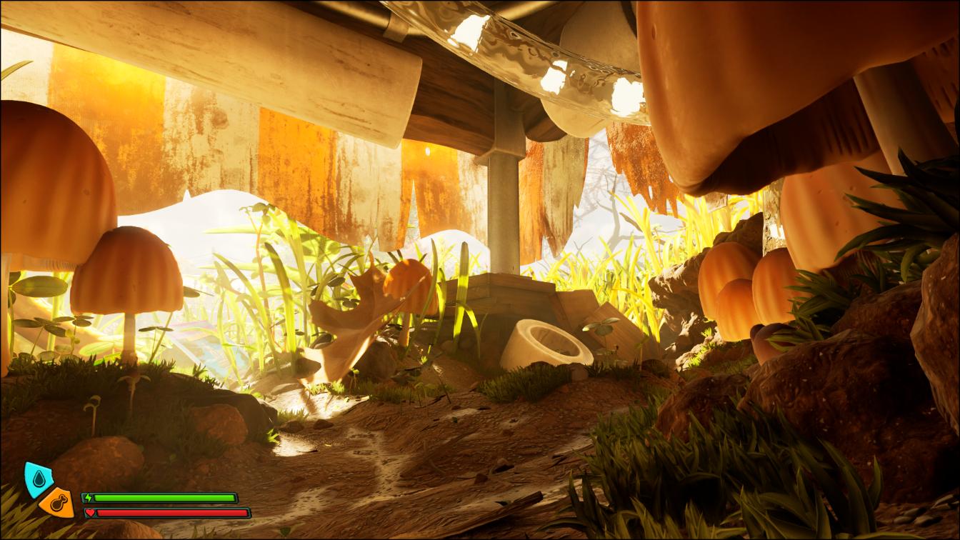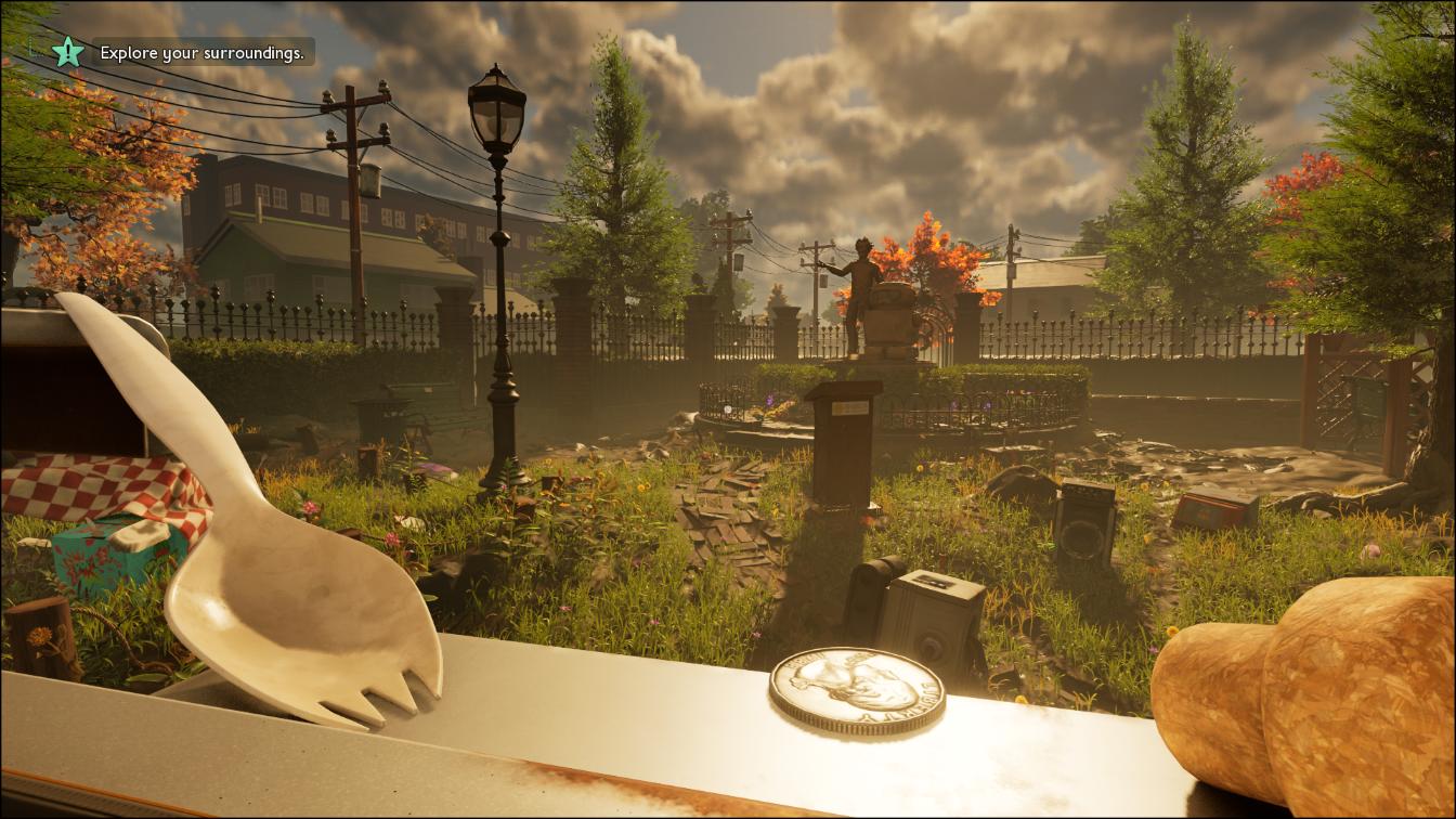 Świat prezentuje się okazale i daje sporo swobody w eksploracji. Kiedy zauważyłam, że kamera wyłapuje większą ostrość na np. trawę w pierwszym planie i rozmywa tło, stwierdziłam, że doszliśmy już do świetnego etapu, jeśli chodzi o rozwój gier. Fajnym smaczkiem jest poruszanie się po lokacjach i odkrywanie porzuconych ulotek, gazet i innych rzeczy. One dla ludzi o normalnych rozmiarach wydają się niewielkie, a w grze stanowią pewnego rodzaju punkty orientacyjne i idealne miejsca na bazy. Promienie porannego słońca przenikają przez trawę, a nocne sceny zlewają się w mrok, który zmusza do wykonania pochodni, by nie zgubić się wśród liści lub nie dać się “zadźgać” przez jakiegoś owada. Tak naprawdę cały świat Brookhollow Park zachwyca różnorodnością. Każda strefa, którą odkrywamy, zyskuje unikalny klimat, a silnik Unreal Engine 5 zdecydowanie wspomaga te walory.