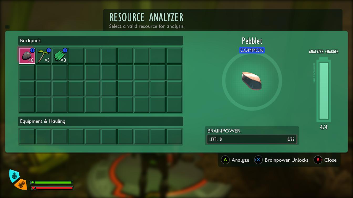W grze możemy zauważyć także Brain Power. To specjalna waluta, dzięki której można kupować nie tylko nowe receptury budowlane, ale również kolejne ulepszenia do Omni-Toola. Zdobywamy ją poprzez dokonywanie analiz nowych zebranych elementów. Od czasu do czasu zauważymy ją również w postaci różowych, neonowych kryształków, które należy zrobić. Najczęściej znajdują się w trudnodostępnych miejscach, wymagających odrobiny pracy, by móc się do niego dostać.