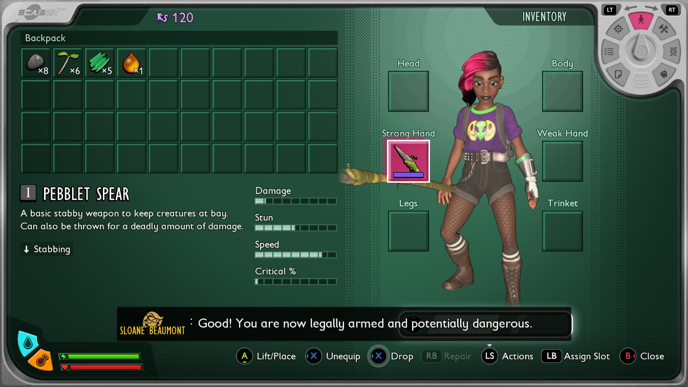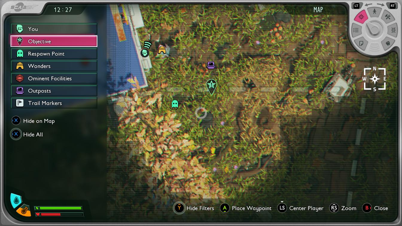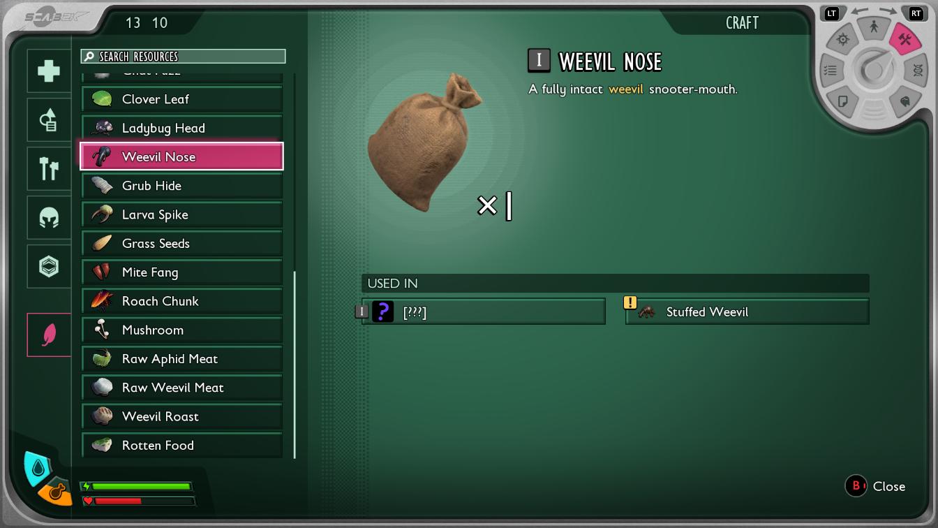 Grounded 2 oferuje przyjemny interfejs, choć wielka szkoda, że nie obsługuje języka polskiego. Niestety nie znam wszystkich roślinno-owadowych nazw po angielsku i musiałam sobie trochę pomagać. Z pewnością w przypadku wersji na PC korzystanie z ekwipunku, mapy i przepisów jest wygodne i intuicyjne. Jeśli chodzi o wersję na Xbox, zajmowało mi chwilę, zanim machnęłam odpowiednim przyciskiem, przez co czasem dochodziło do pomyłek. Szczególnie kiedy zrozumiałam, że niekoniecznie umiem w znaczniki na mapie, które ostatecznie raczej nie działają.