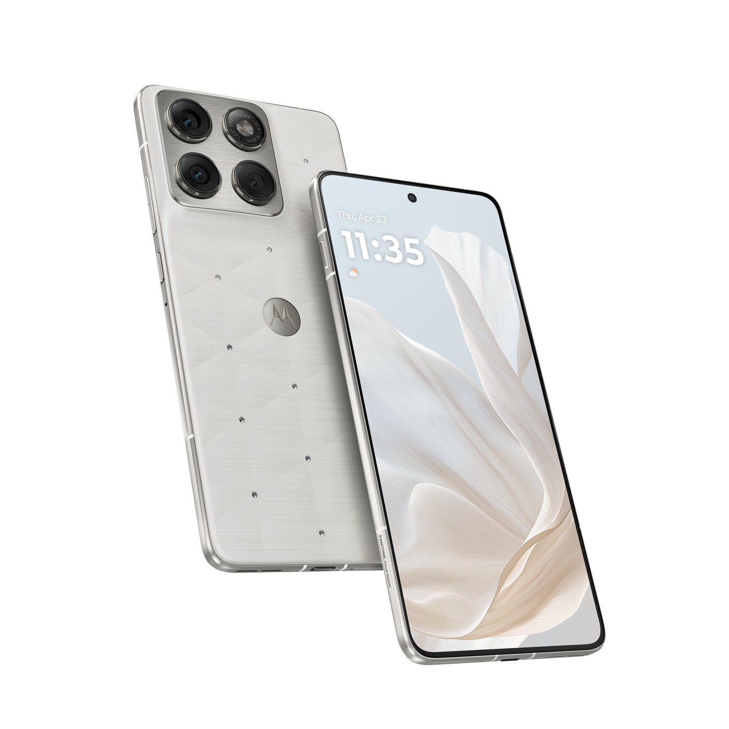 Nowa wersja w odcieniu PANTONE 11-4201 Cloud Dancer podkreśla nowoczesny charakter projektu i wieloletnią współpracę Motoroli z Pantone. Eleganckie kryształy Swarovski nadają urządzeniu bardziej luksusowy wygląd, a jednocześnie wzmacniają wyrazisty, modowy styl smartfona. Kryształy umieszczono bezpośrednio w obudowie, co dodaje całości lekkości i delikatnej, biżuteryjnej ekspresji. W połączeniu z jasnym kolorem Cloud Dancer tworzą harmonijną kompozycję. Sprzyja ona skupieniu i wprowadza odrobinę spokoju do dynamicznej, cyfrowej codzienności.