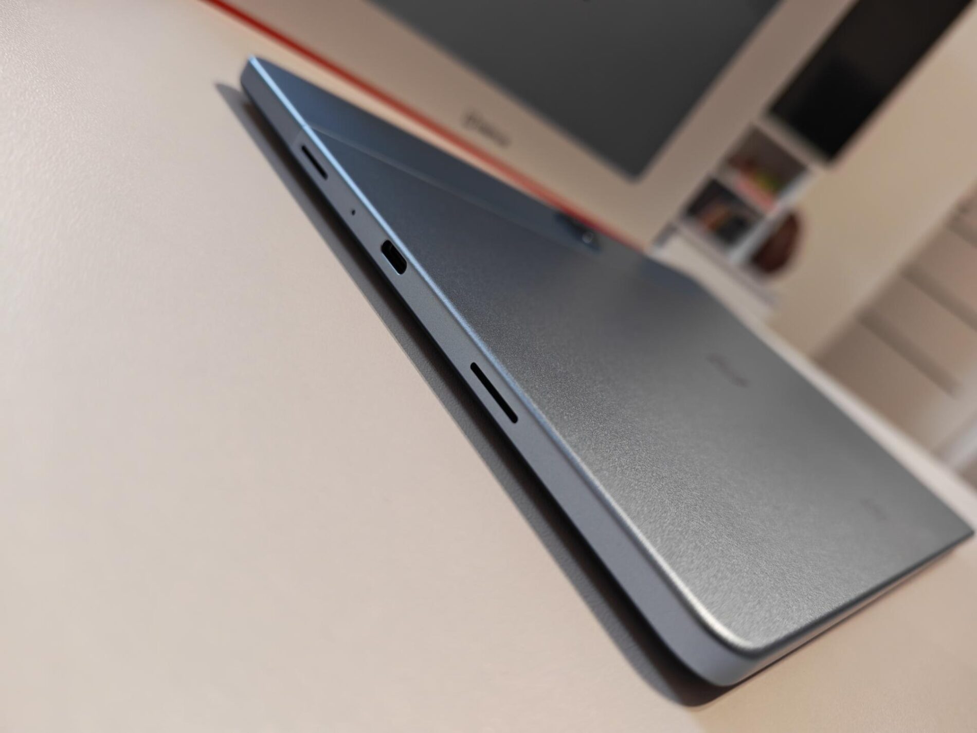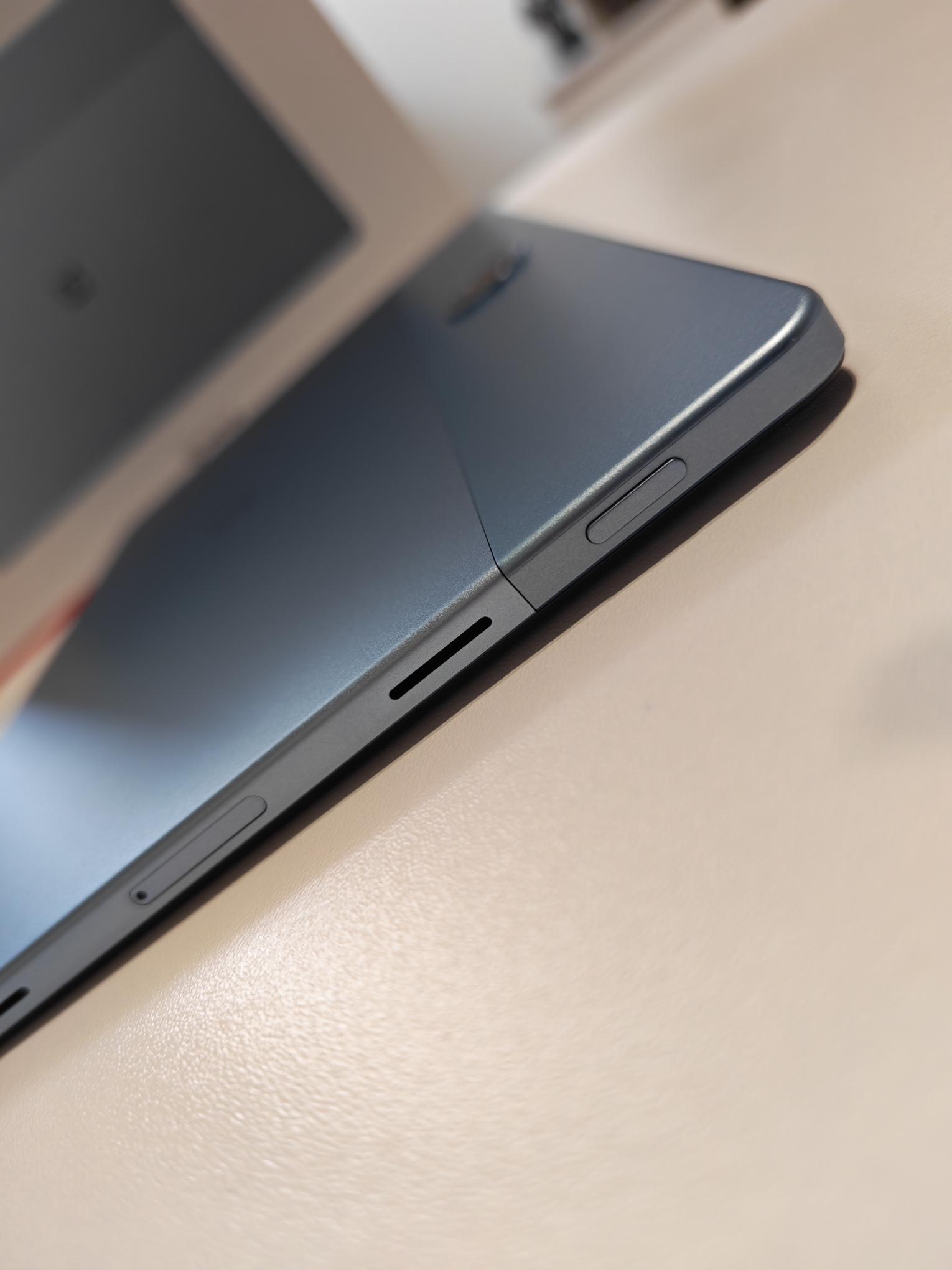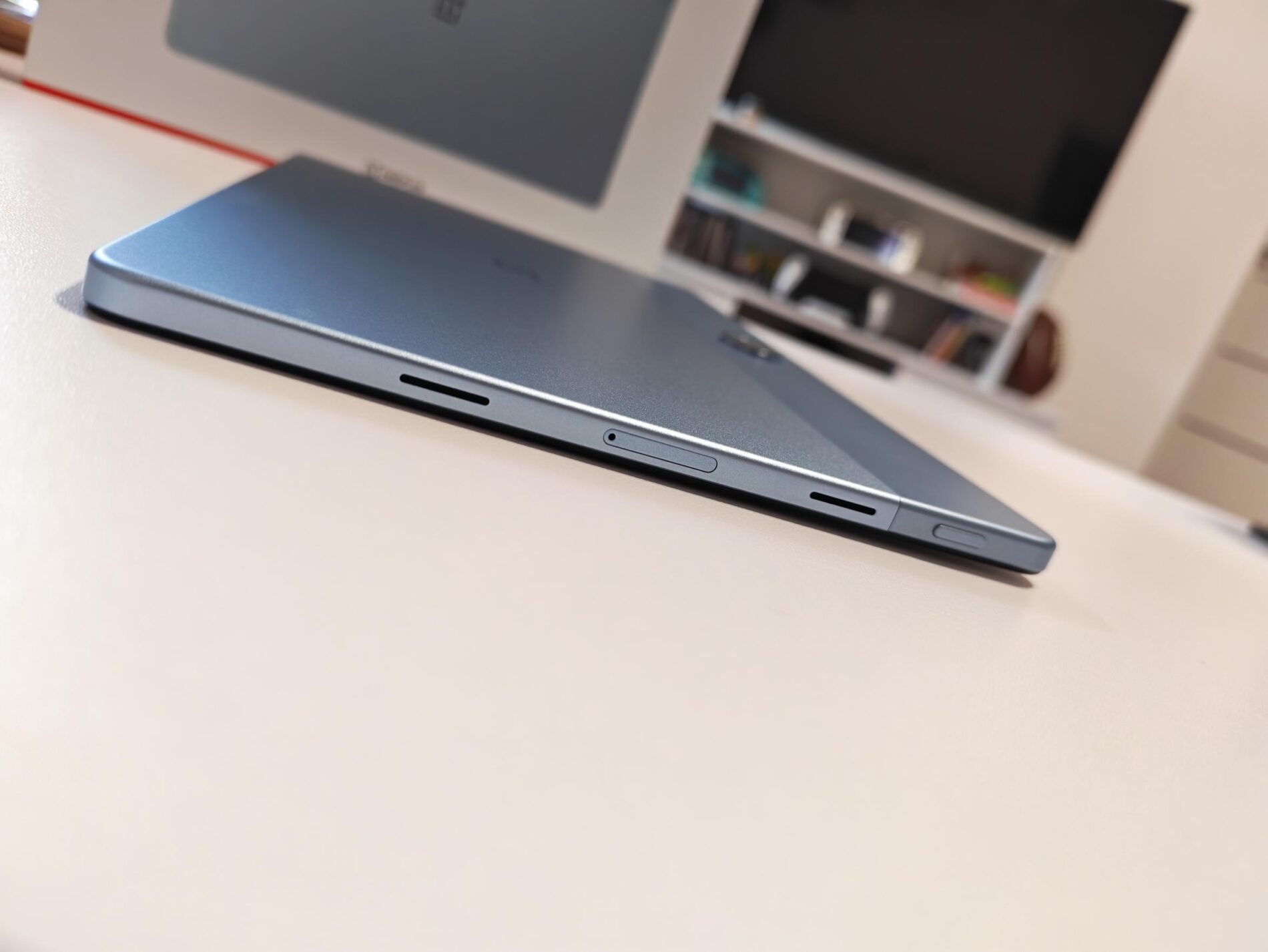 Wygląda dobrze, prawda? Aluminiowa obudowa ma matowe wykończenie, przez co prezentuje się elegancko i sprawia wrażenie produktu premium. Metalowe plecy dodają solidności, jednak odnoszę wrażenie, że bez dodatkowego etui lekko się ślizga. Możliwe również, że to kwestia moich niezbyt dużych dłoni. Samo urządzenie ma ok. 7,39 mm grubości i waży 530 gramów, przez co z całą pewnością poczujecie, że macie tablet w dłoni. Choć przyznaję, że jest cienki i łatwo go chwycić.