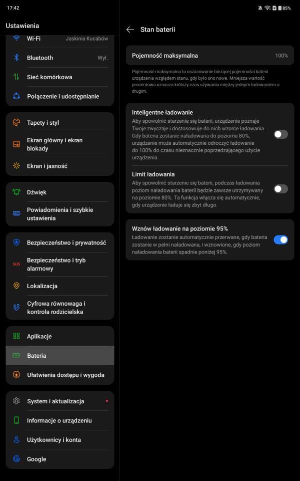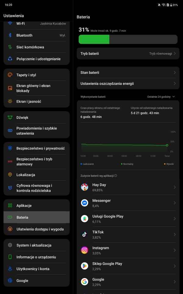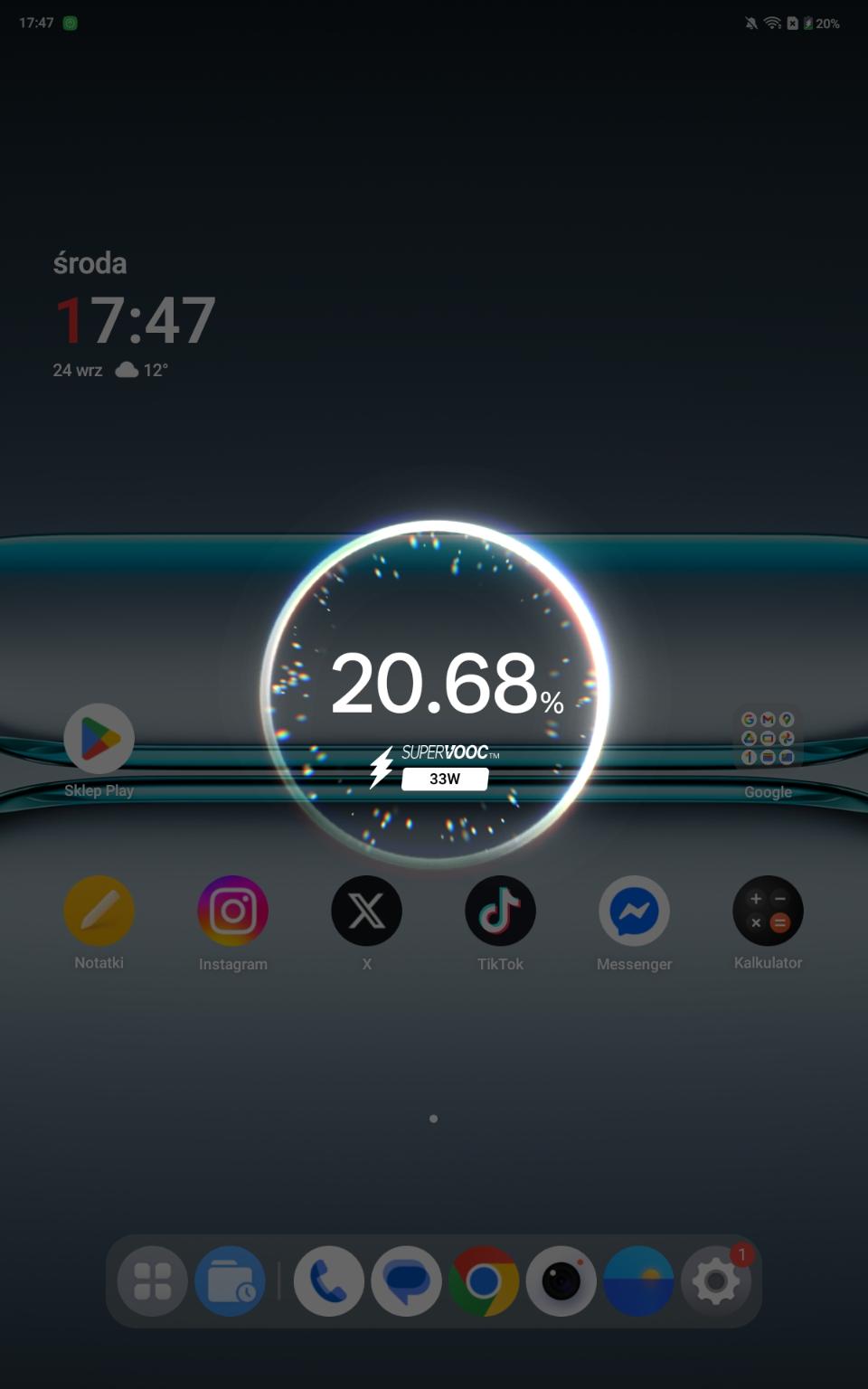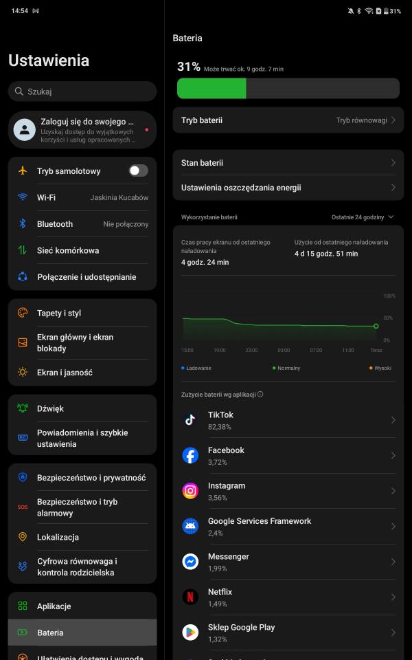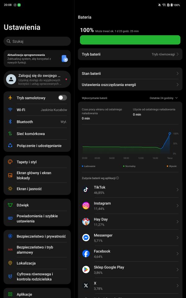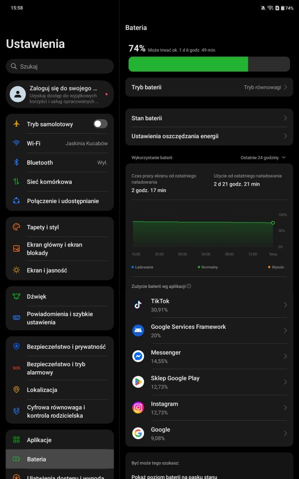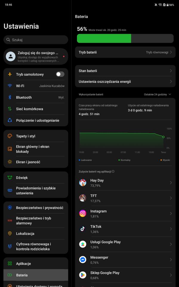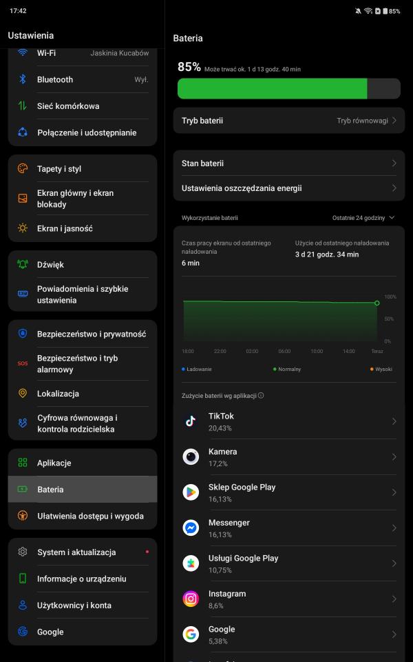 Bateria i czas działania na jednym ładowaniu to na ten moment chyba jeden z najważniejszych aspektów podczas wybierania nowego urządzenia. OnePlus Pad Lite może pochwalić się baterią o pojemności 9340 mAh, co jest całkiem solidnym wynikiem, nawet jak na tablet. Podczas zwykłego użytkowania (mam tu na myśli przeglądanie mediów społecznościowych czy oglądanie serialu) tablet potrafi działać przez 2-3 dni. Ba, nawet jak oglądałam dłużej TikToka codziennie, to nie musiałam się martwić o to, że trzeba tablet podłączyć za moment do ładowarki. Kiedy użytkowany był sporadycznie i więcej sobie leżał, osiągał notę prawie 6 dni. To się może podobać, tym bardziej że w trybie czuwania ma działać ponad 50 dni.
