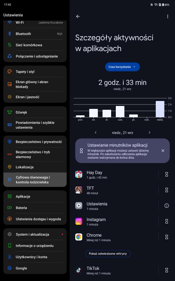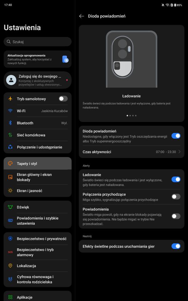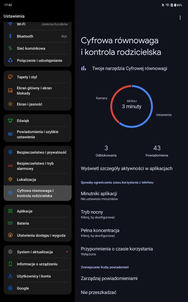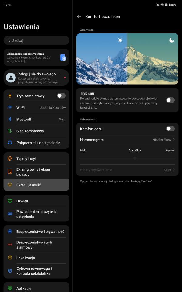 Tryb Eye Comfort automatycznie ogranicza ilość niebieskiego światła i zmniejsza migotanie ekranu. Dla rodziców przygotowano osobny tryb Kids Mode, który pozwala ustawić limity czasu, ograniczyć dostęp do wybranych aplikacji i zadbać o ochronę oczu.