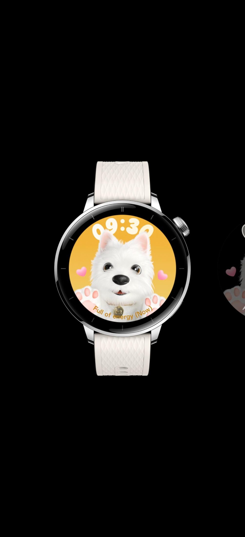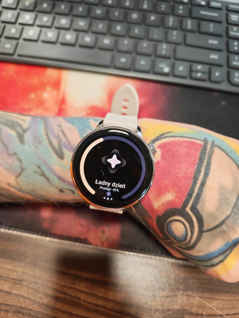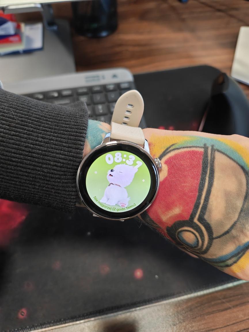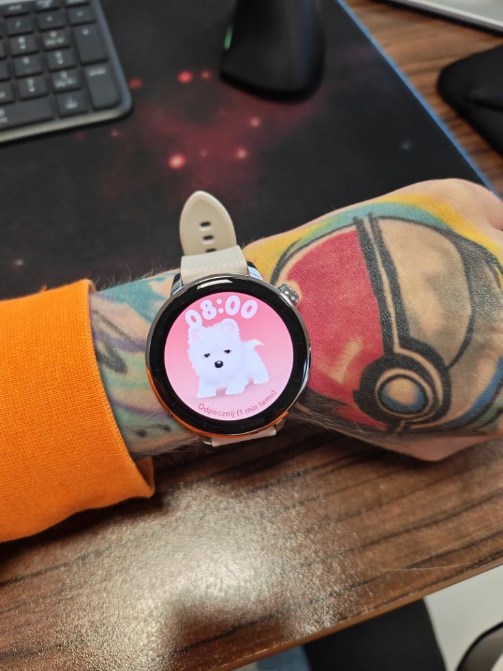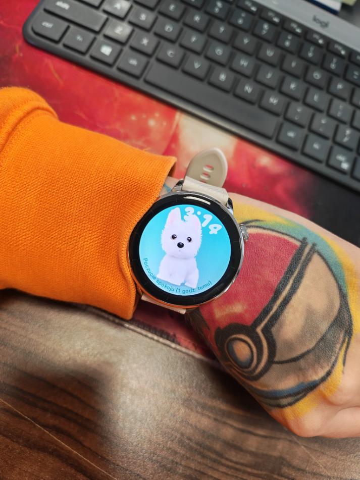 W OnePlus Watch 3 43 mm tarcze zegarka możemy zmieniać bezpośrednio na zegarku lub przez aplikację. Długie przytrzymanie aktualnie wyświetlanej tarczy pozwala przejść do wyboru spośród dostępnych wzorów, przesuwać w lewo/prawo i wybrać odpowiednią. Można ustawić animowaną tarczę (np. krótki film), jednak jak już wspomniałam, wiąże się to ze znacznie większym zużywaniem baterii. Ja bardzo polubiłam się z pieskiem i wykorzystywałam jego aurę. W momencie, w którym o godzinie 9:00 sugerował mi, że muszę odpocząć, zasugerowałam w pracy, że muszę się go posłuchać. Efekt? Po prostu udałam się do kuchni po kawę.
