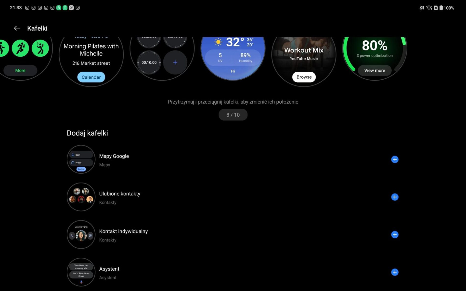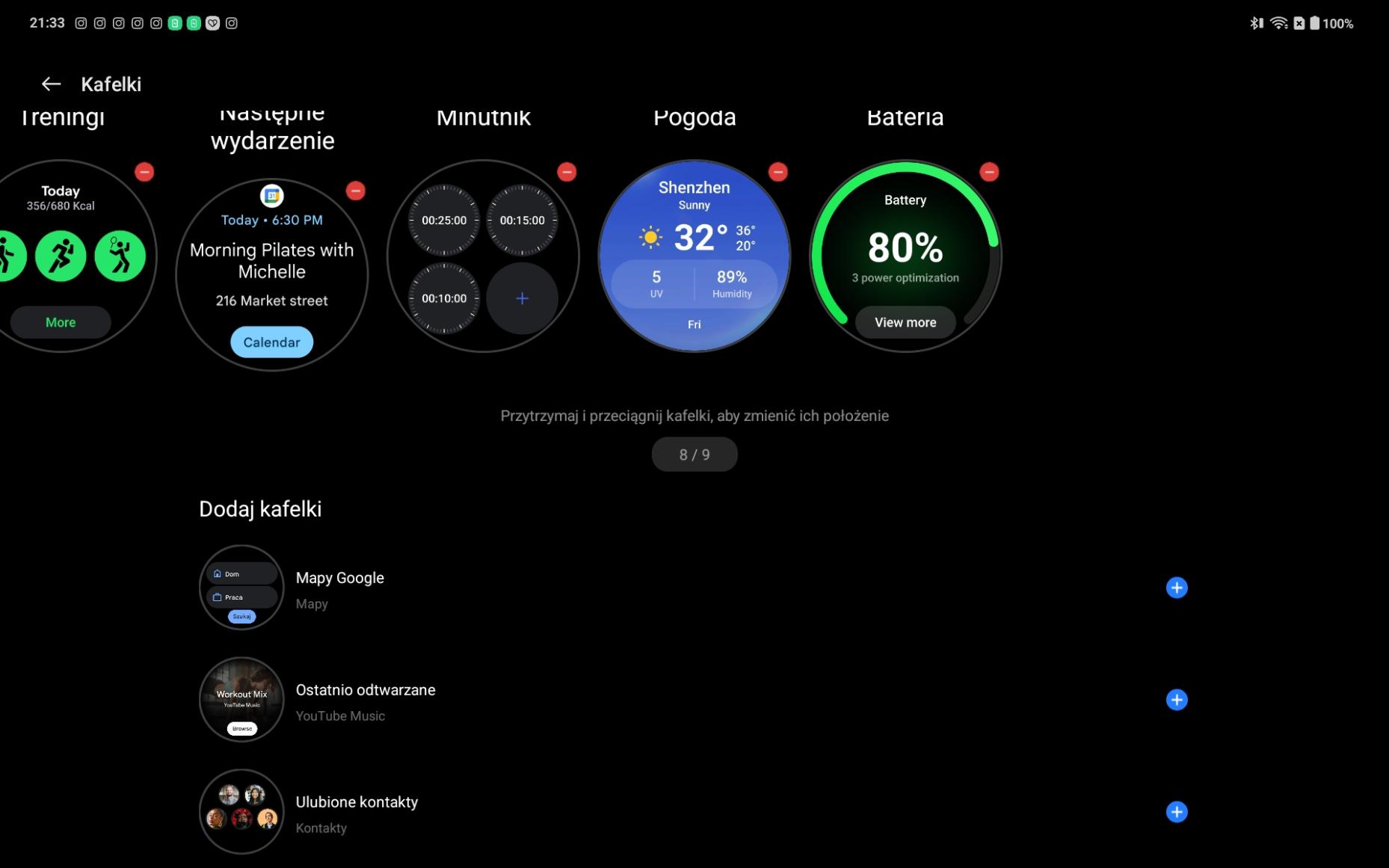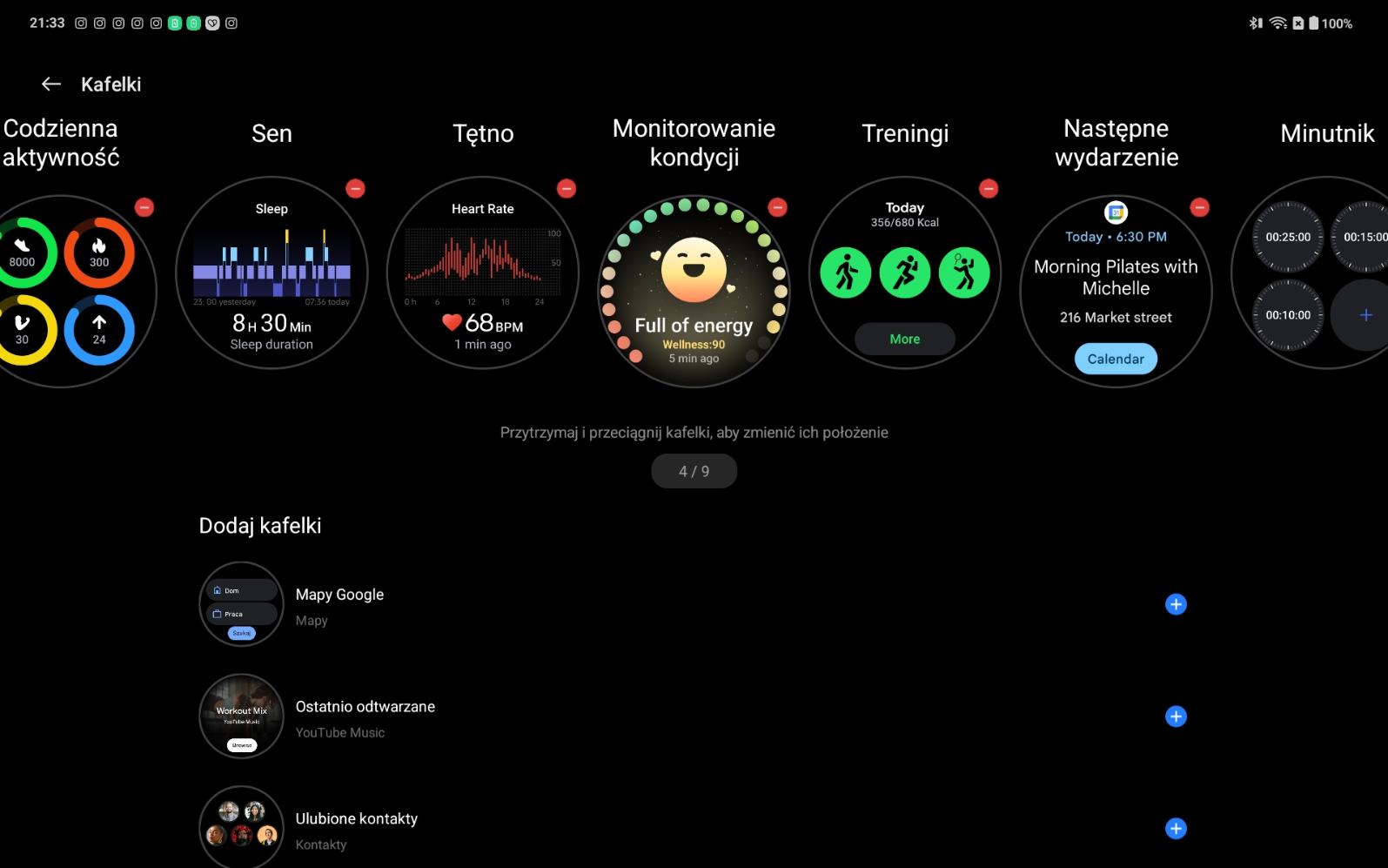 W OnePlus Watch 3 43 mm tarcze zegarka możemy zmieniać bezpośrednio na zegarku lub przez aplikację. Długie przytrzymanie aktualnie wyświetlanej tarczy pozwala przejść do wyboru spośród dostępnych wzorów, przesuwać w lewo/prawo i wybrać odpowiednią. Można ustawić animowaną tarczę (np. krótki film), jednak jak już wspomniałam, wiąże się to ze znacznie większym zużywaniem baterii. Ja bardzo polubiłam się z pieskiem i wykorzystywałam jego aurę. W momencie, w którym o godzinie 9:00 sugerował mi, że muszę odpocząć, zasugerowałam w pracy, że muszę się go posłuchać. Efekt? Po prostu udałam się do kuchni po kawę.