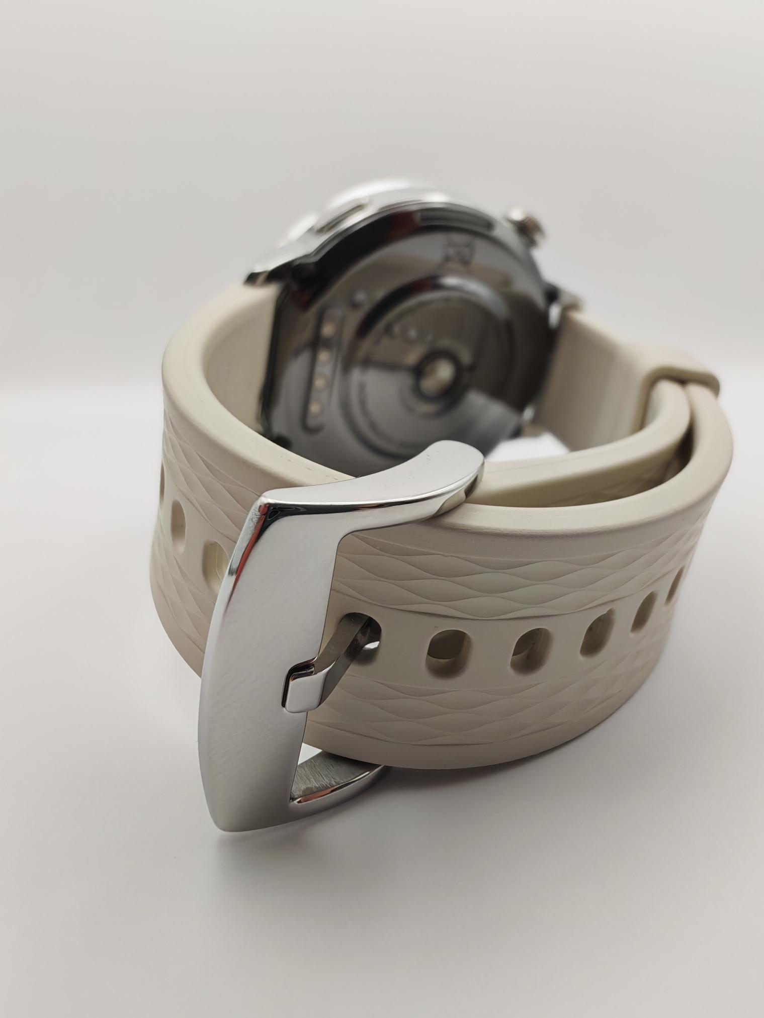 Serce zegarka – koperta – została wykonana ze stali nierdzewnej o uniwersalnym i przyjemnym wizualnie wykończeniu. Ponadto jest polerowana, co jeszcze bardziej podkreśla szczegółowość jej wykonania. Stylowa koronka wykonana jest z tych samych materiałów, a przy tym pozwala poczuć się tak, jakby na nadgarstku leżał tradycyjny, klasyczny zegarek. Model ten jest mniejszy i lżejszy niż druga wersja 47 mm. Jest to propozycja bardziej komfortowa dla osób ze smuklejszymi nadgarstkami. Z moim komponował się wręcz idealnie.