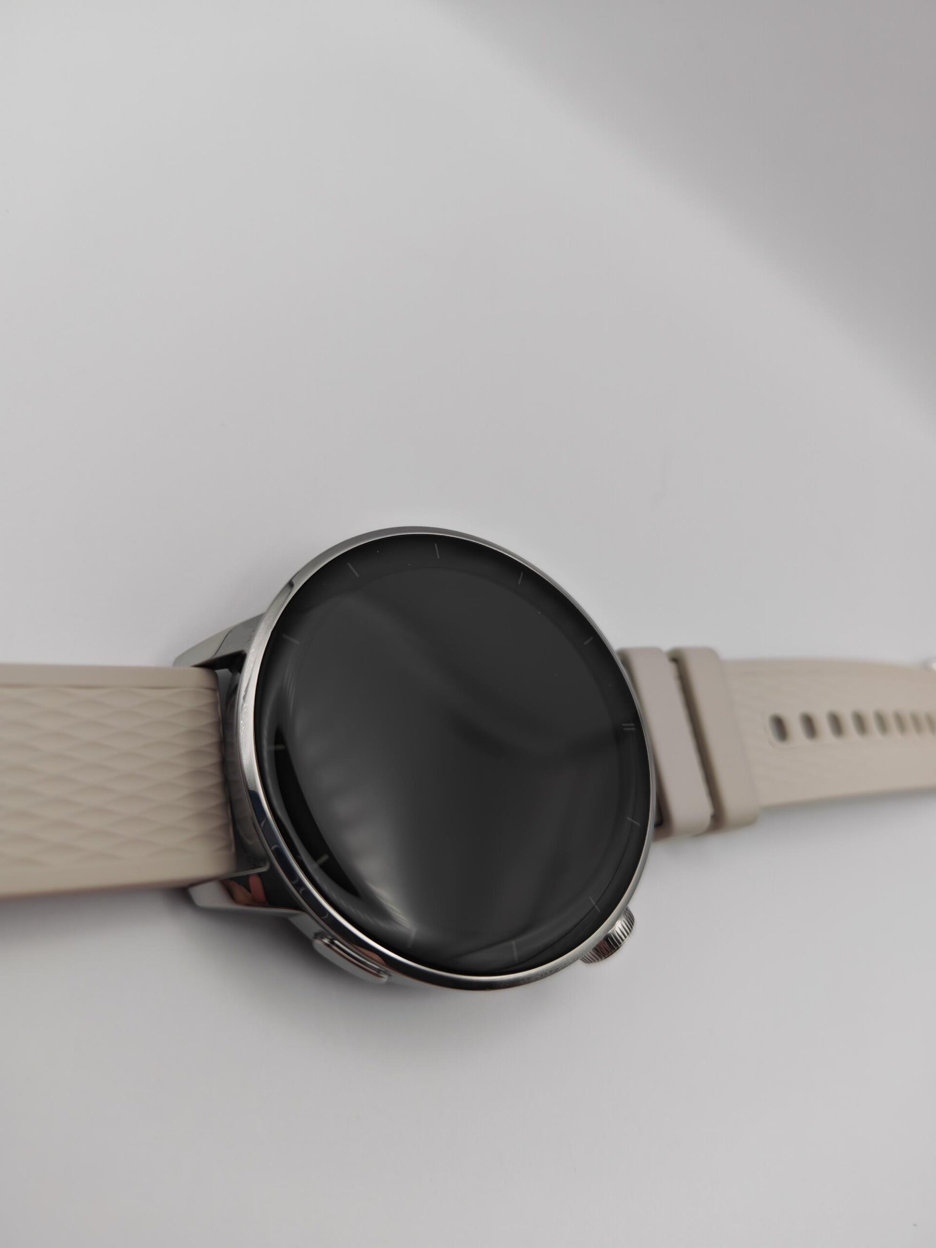 Ekran smartwatcha to wyświetlacz AMOLED 1.32″ 2.5D o bardzo dobrej jasności i rozdzielczości 466 x 466 pikseli. Oferuje naprawdę bardzo czytelny obraz nawet w pełnym słońcu, bez konieczności zasłaniania lub zwiększania jasności w trakcie spaceru. Szkoda, że nie został on pokryty np. szkłem szafirowym, które mogłoby zwiększyć trwałość i odporność na zarysowania. Nie będę ukrywać, że niejednokrotnie poczułam mocniejsze bicie serca, kiedy przypadkowo o coś zahaczyłam. Zegarek bez paska waży zaledwie 37.8 g, co można zaliczyć na zdecydowany plus.