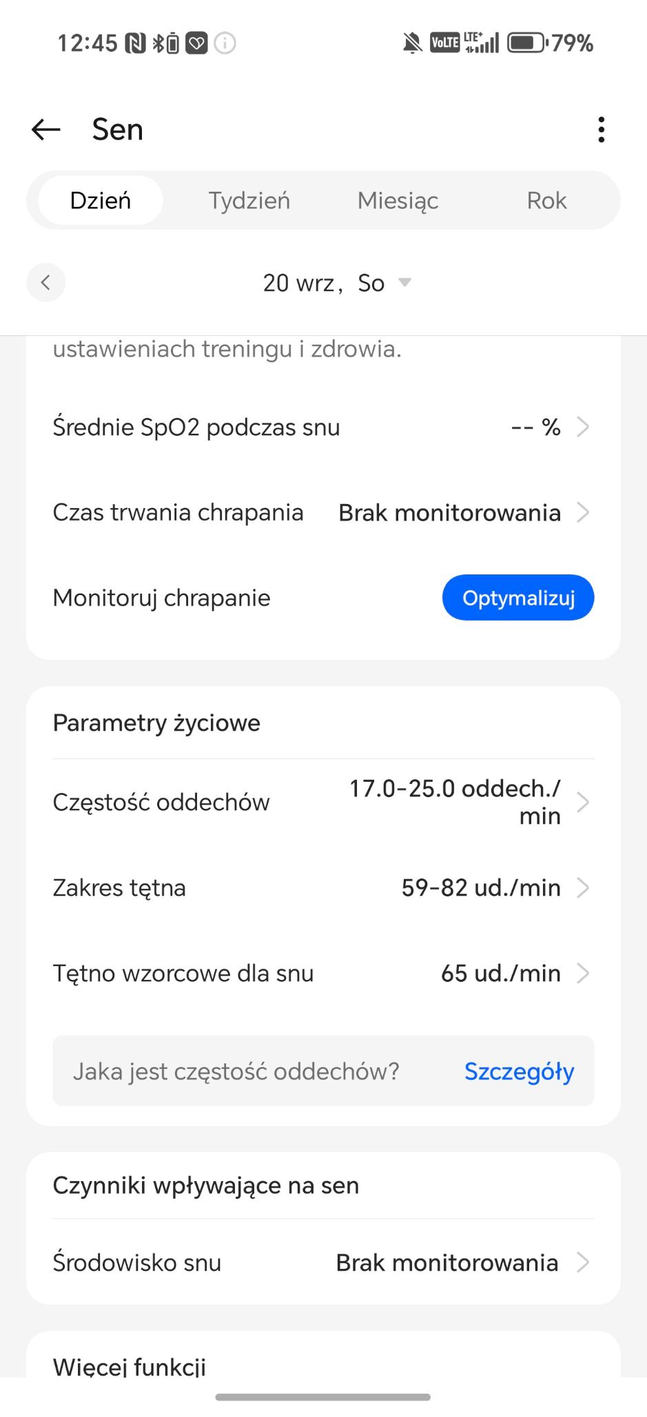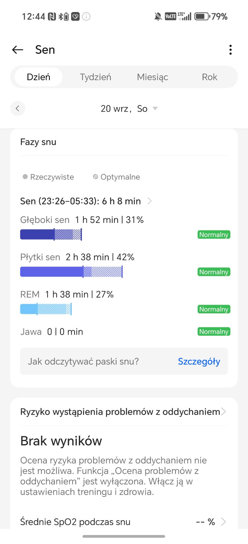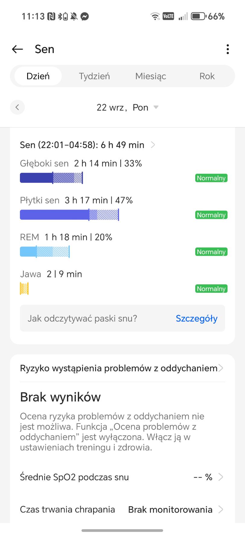Analiza snu w OnePlus Watch 3 43 mm działa bardzo dobrze, choć i momentami podejrzanie. W trakcie choroby zegarek podczas mojego leżenia (nie snu) na kanapie stwierdzał, że ciagle mam drzemkę i dostarczał mi jej analizę. Czy to oznacza, że będąc w chorobie, jestem zombie? Wracając, smartwatch rejestruje czas trwania, fazy snu (lekki, głęboki, REM), przerwy w czuwaniu, tętno, zmienność rytmu serca, oddech oraz poziom tlenu we krwi. Potrafi także ocenić ryzyko problemów oddechowych, takich jak bezdech senny, a dodatkowo wykrywa chrapanie. Dużym ułatwieniem jest możliwość automatycznego uruchamiania trybu nocnego i automatycznego wykrywania snu – właśnie to ostatnie wykrywa sen nawet wtedy, gdy go nie ma. Oczywiście zgodnie ze sztuką tego typu urządzeń, wszystkie informacje lądowały w raportach znajdujących się w aplikacji.