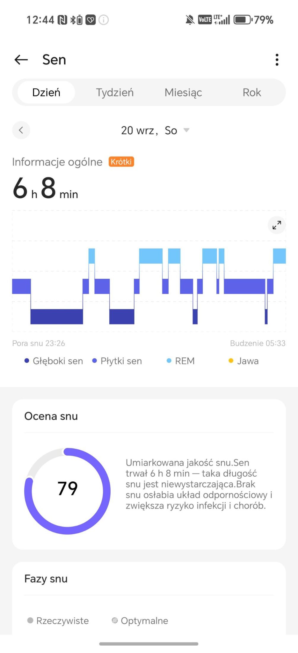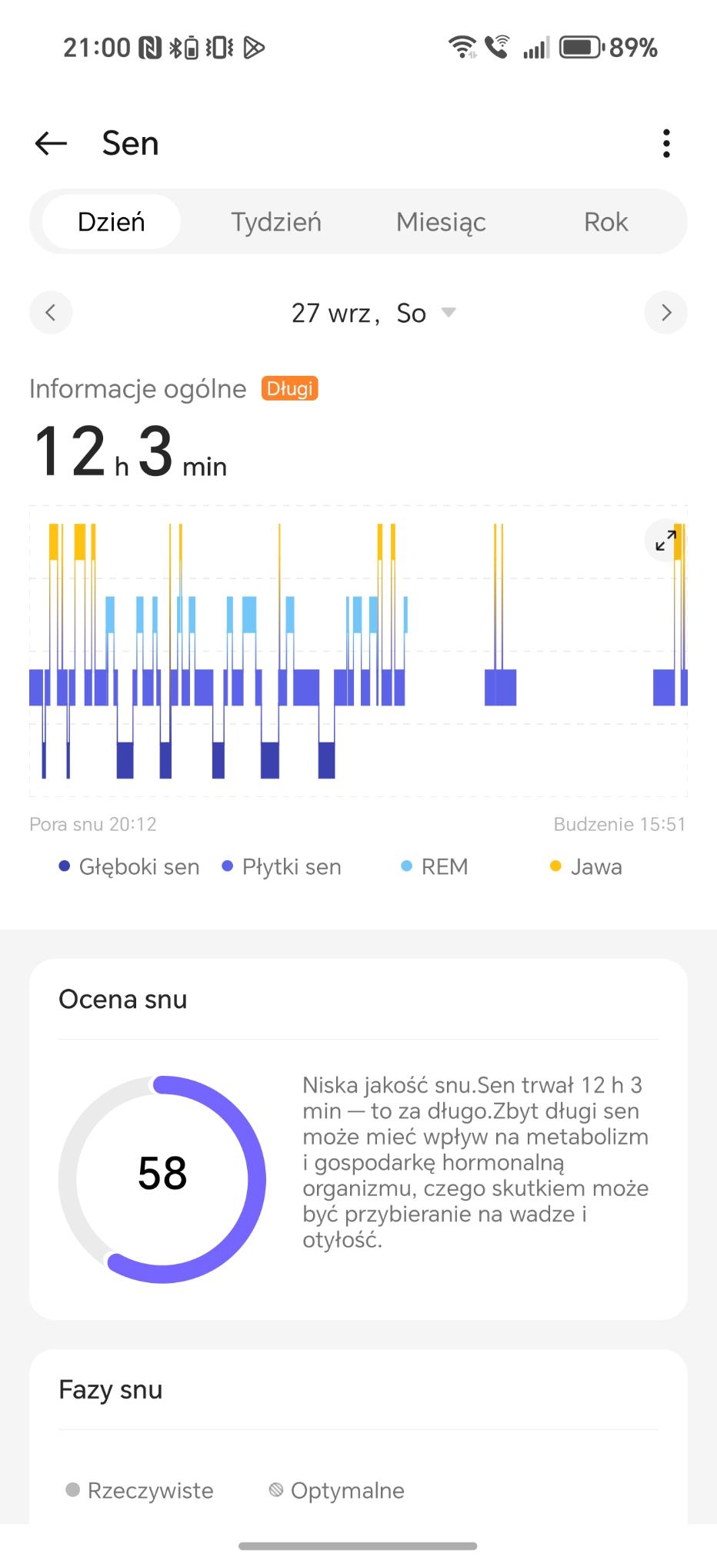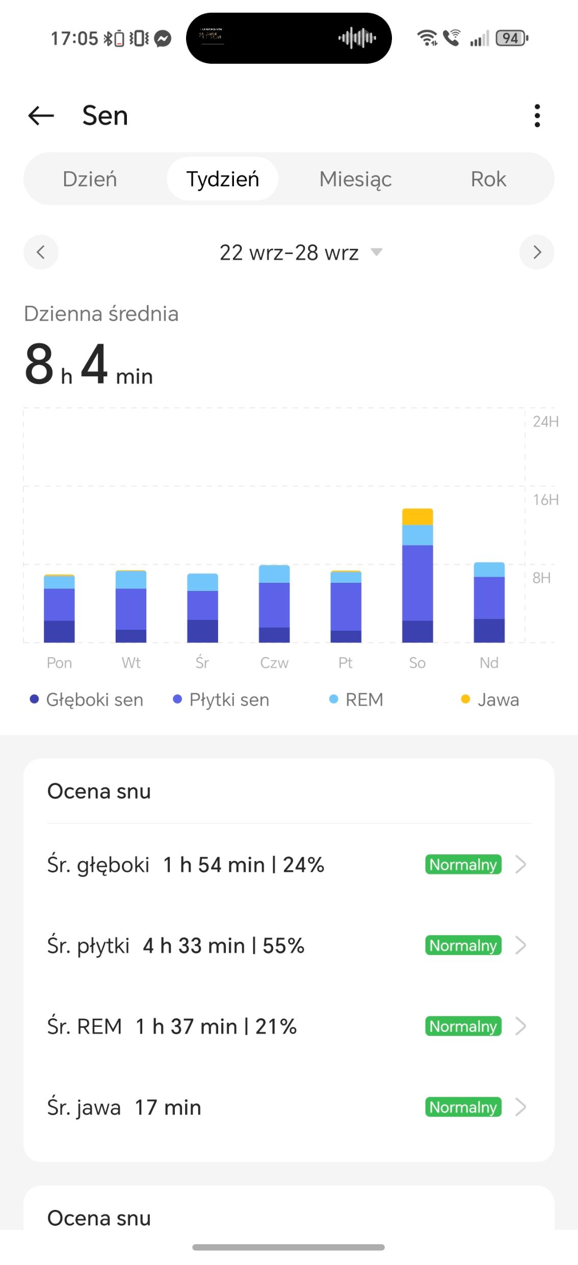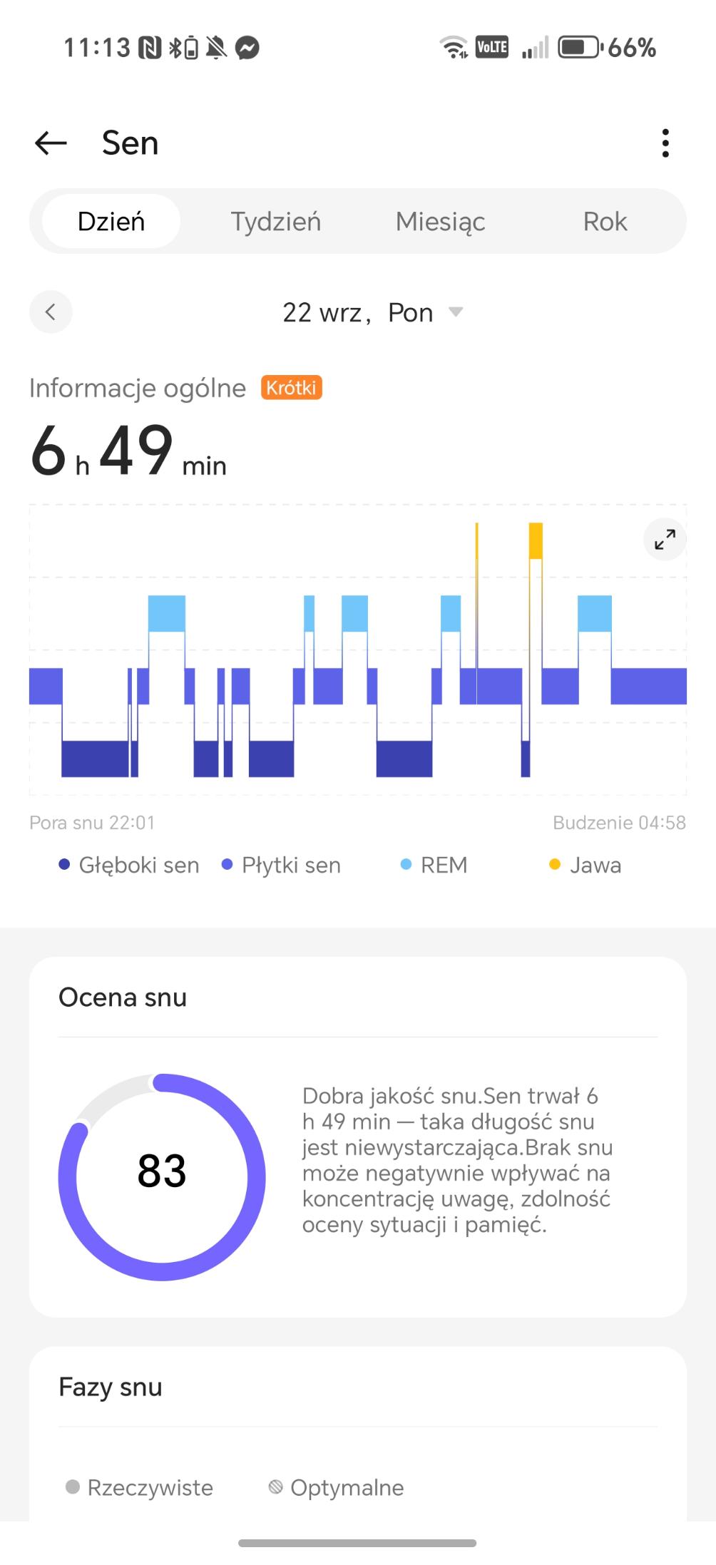Analiza snu w OnePlus Watch 3 43 mm działa bardzo dobrze, choć i momentami podejrzanie. W trakcie choroby zegarek podczas mojego leżenia (nie snu) na kanapie stwierdzał, że ciagle mam drzemkę i dostarczał mi jej analizę. Czy to oznacza, że będąc w chorobie, jestem zombie? Wracając, smartwatch rejestruje czas trwania, fazy snu (lekki, głęboki, REM), przerwy w czuwaniu, tętno, zmienność rytmu serca, oddech oraz poziom tlenu we krwi. Potrafi także ocenić ryzyko problemów oddechowych, takich jak bezdech senny, a dodatkowo wykrywa chrapanie. Dużym ułatwieniem jest możliwość automatycznego uruchamiania trybu nocnego i automatycznego wykrywania snu – właśnie to ostatnie wykrywa sen nawet wtedy, gdy go nie ma. Oczywiście zgodnie ze sztuką tego typu urządzeń, wszystkie informacje lądowały w raportach znajdujących się w aplikacji.