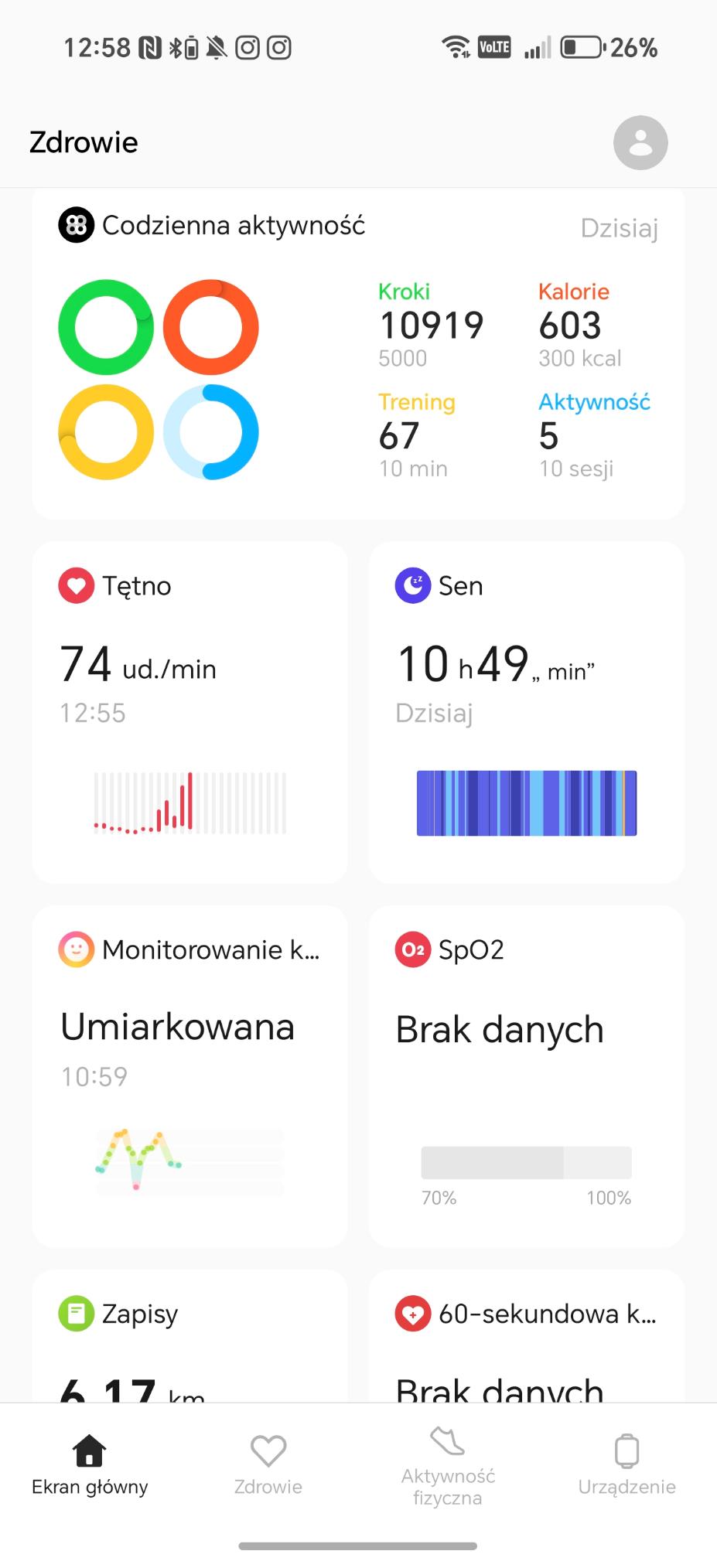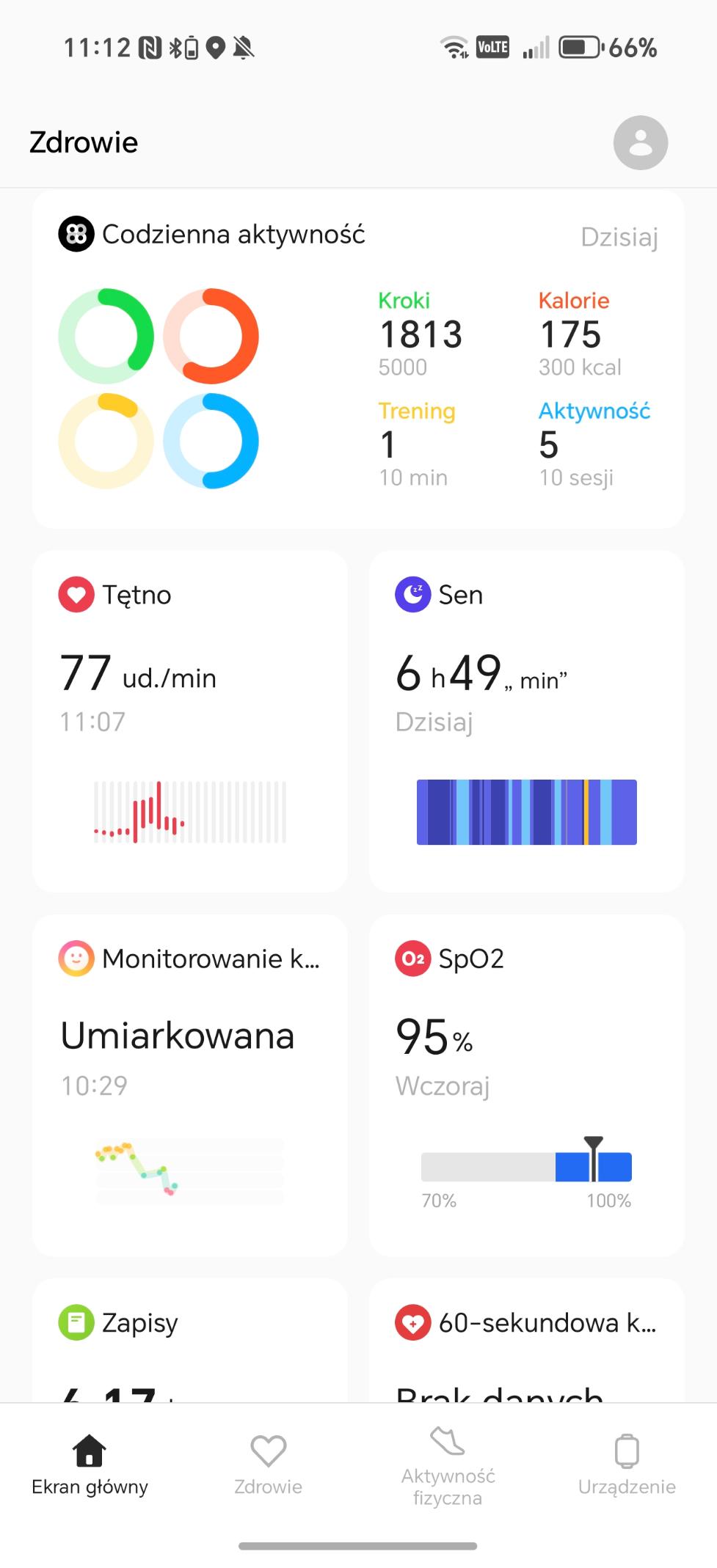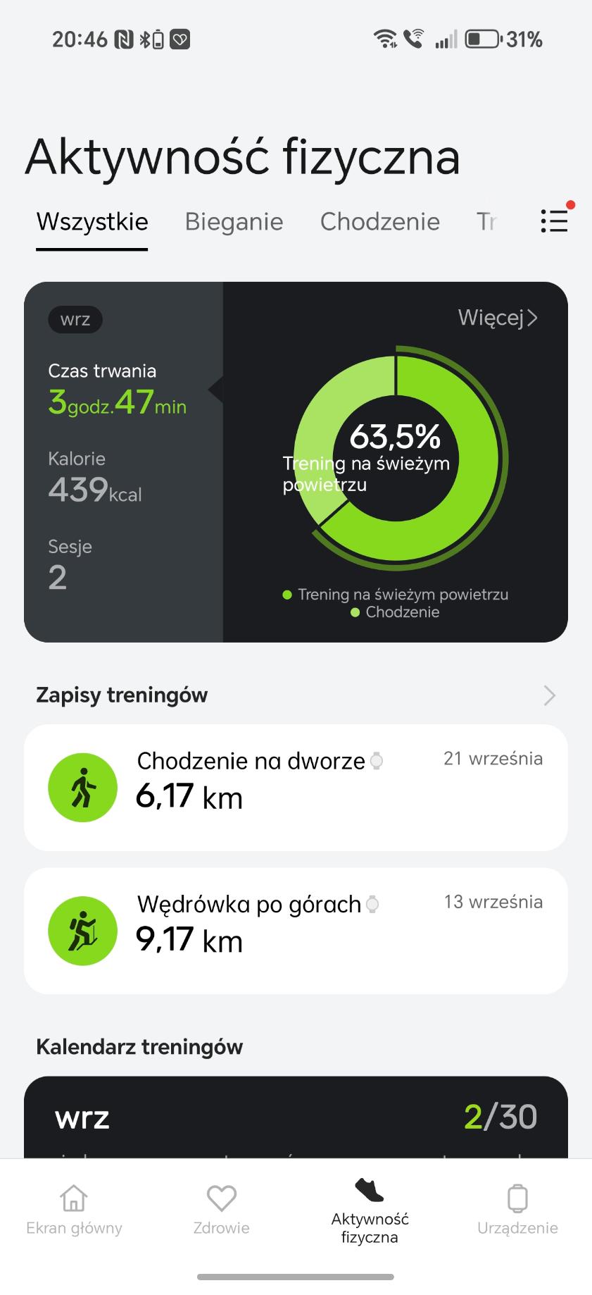 Mimo failu z wycieczką w góry, wybrałam się na spacer by zobaczyć, jak zegarek sobie poradzi. W aplikacji prezentacja danych wydaje mi się dość surowa i ponura, przez co nie zachęcała mnie ona do dalszych aktywności w ostatnie słoneczne dni września. Najważniejszy pozostaje przy tym fakt, że zegarek jest niemal niewyczuwalny podczas treningów.