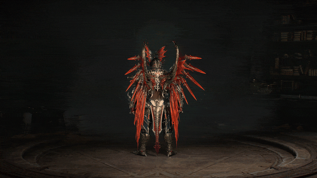 Każde kolejne zwycięstwo z tym zestawem zmienia wizualny charakter walki – skrzydła rozbłyskują energią, a wrogowie giną w aurze szkarłatnego gniewu.
