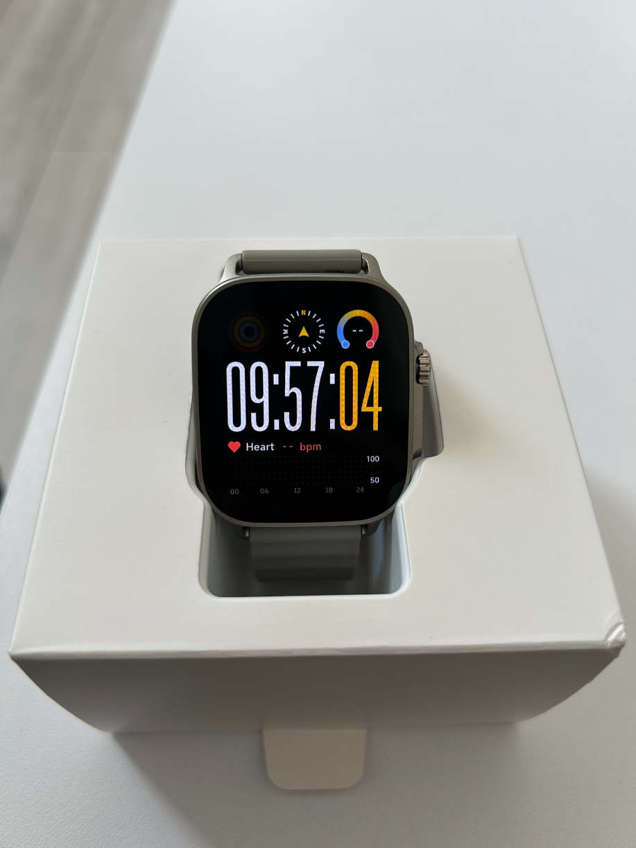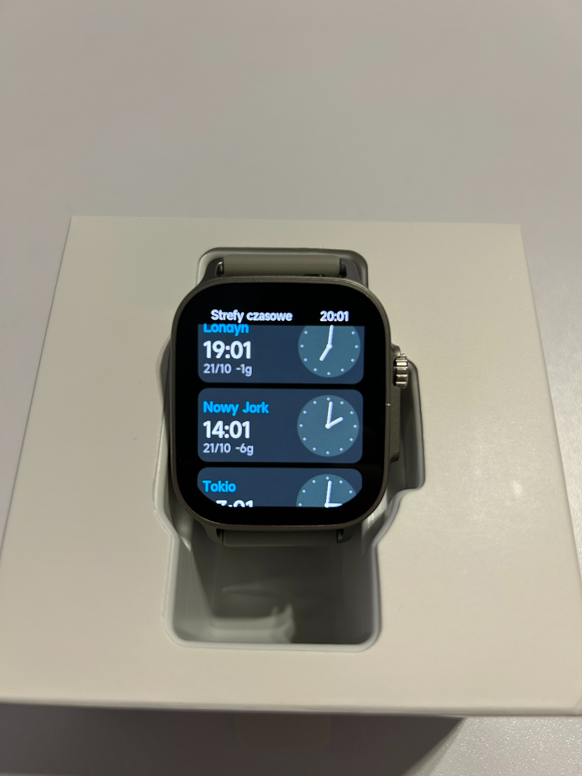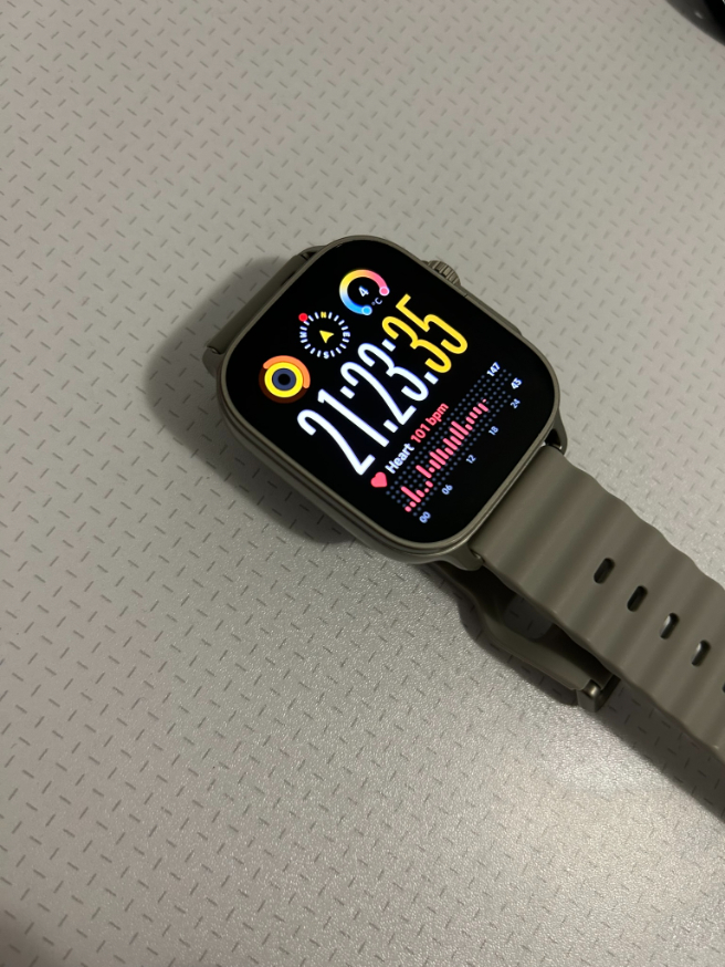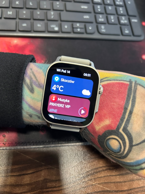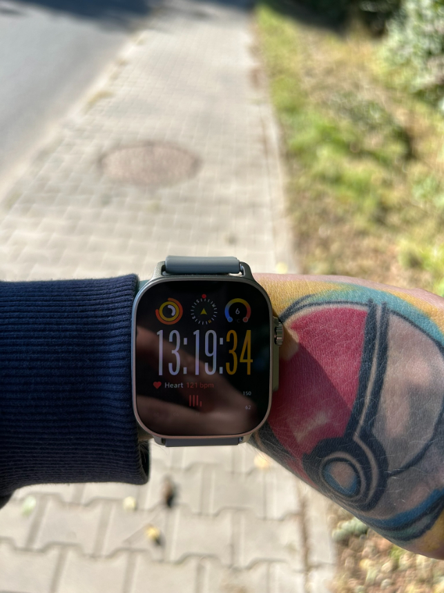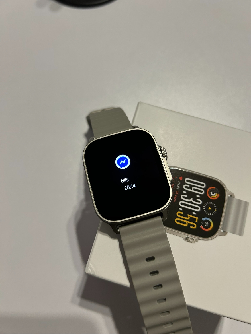 Zegarek sprawia wrażenie nowoczesnego i dopracowanego urządzenia, z solidnym podobieństwem do Apple Watcha – nie powiecie mi, że tak nie jest. Koperta powstała z tworzywa sztucznego, a ramki wokół ekranu są dość szerokie. Nie tylko rzucają się w oczy podczas użytkowania, ale uwierzcie mi, że jeden nieprzemyślany ruch, stuknięcie w biurko i zostanie na niej ślad. Smartwatch ma duży, 1,97″ ekran AMOLED o rozdzielczości 390×450 pikseli. Obraz przez większość czasu jest wyraźny, kolory żywe, a nawet te mniejsze napisy pozostają doskonale czytelne. Niestety chwilami widziałam piksele, ale wystarczyło zrzucić okulary (ale suchar). Urządzenie płynnie reaguje na dotyk i nie sprawia w tym aspekcie żadnych problemów.