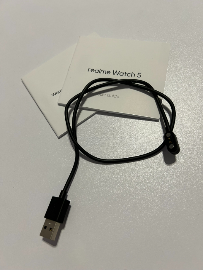 Po otwarciu pudełka oczom ukazuje się bohater dzisiejszej recenzji, a mianowicie zegarek realme Watch 5 wyposażony od razu w pasek. W moim przypadku wpadła wersja srebrna, pasująca do wszystkiego. Wracając do zawartości opakowania, znajdziemy w nim również magnetyczny przewód ładujący z wtyczką USB-A, zakończony złączem dopasowanym do pinów koperty. W zestawie dołączono również krótką instrukcję obsługi oraz kartę gwarancyjną. Skromnie, ale po co coś więcej do zegarka? Ewentualnie nie obraziłabym się za jakieś etui na kopertę i szkło na ekran (odzywa się moja nadmierna dbałość o elektronikę…).